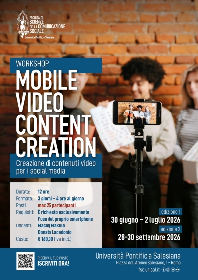 Mobile Video Content Creation: edizione IPrima edizione del workshop, promosso dalla Facoltà di Scienze della Comunicazione sociale, dal titolo Mobile Video Content Creation. Un percorso pratico dedicato alla produzione di contenuti video per i social media attraverso l’uso dello smartphone. L’iniziativa offrirà ai partecipanti competenze su ripresa, montaggio e linguaggi delle principali piattaforme digitali, con un focus sull’integrazione dell’Intelligenza Artificiale nei processi creativi.